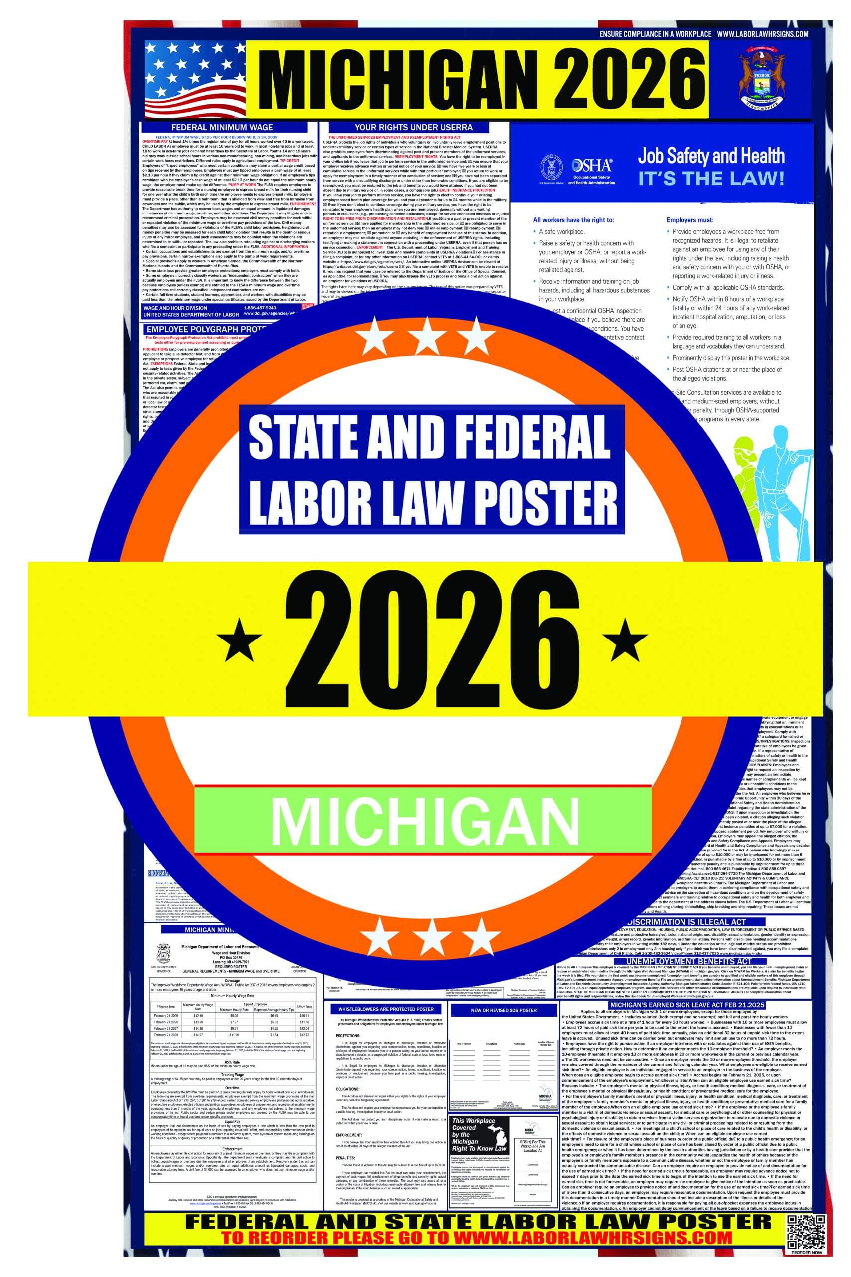 Our Update Plan Program Provides All Of the Updates for the your 2026 Michigan Labor Law Poster. Please Select ” Updates Program Plan ” on the following page and Receive All Of the Updates for Your 2026 Workplace Posters, 2026 , 2026 Minimum Wage Posters and all of the Federal And State 2026 Michigan Labor Law Posters”.