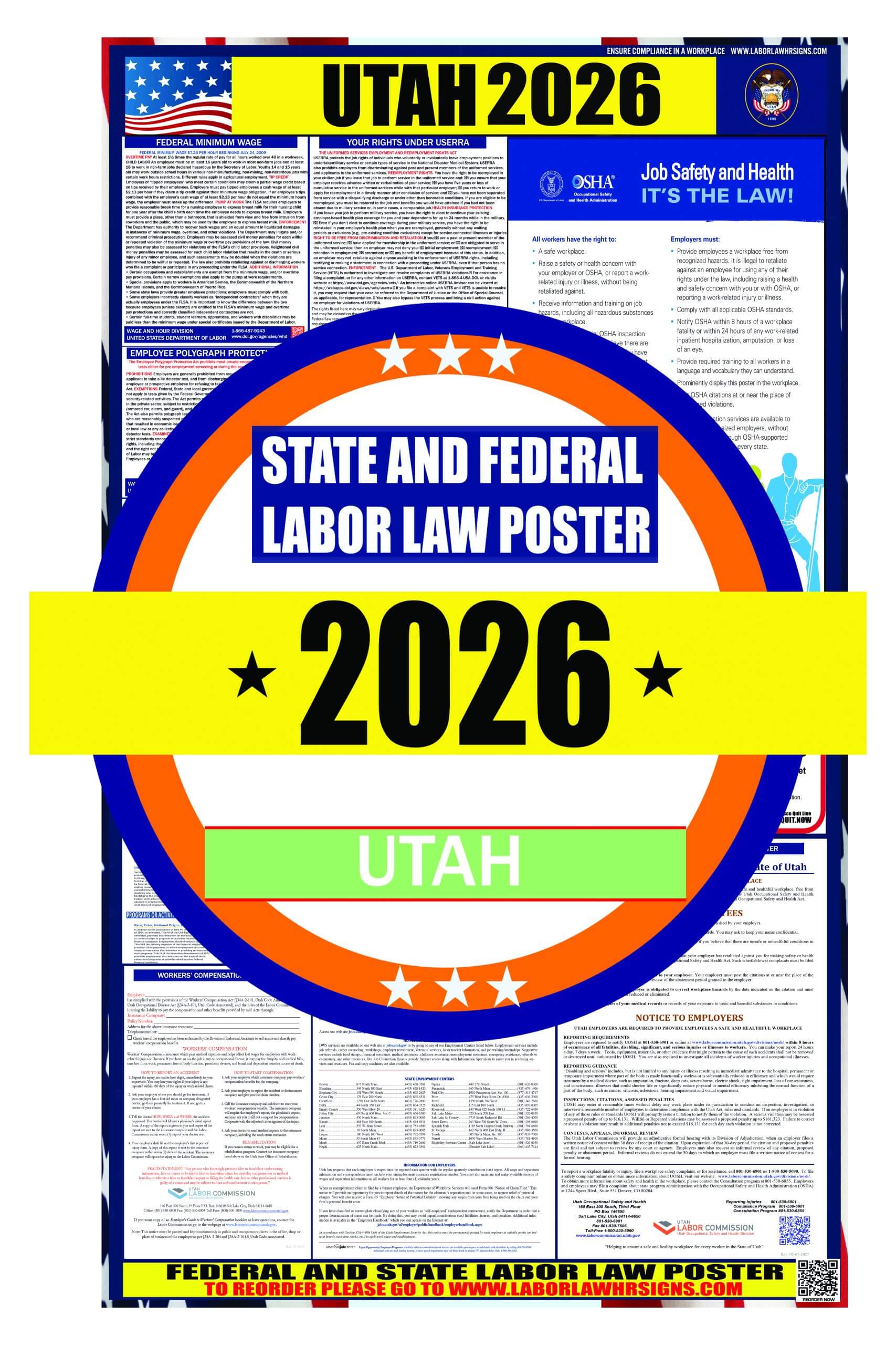 Our Update Plan Program Provides All Of the Updates for the your 2026 Utah Labor Law Poster. Please Select ” Updates Program Plan ” on the following page and Receive All Of the Updates for Your 2026 Workplace Posters, 2026 , 2026 Minimum Wage Posters and all of the Federal And State 2026 Breakroom Compliance Posters”.